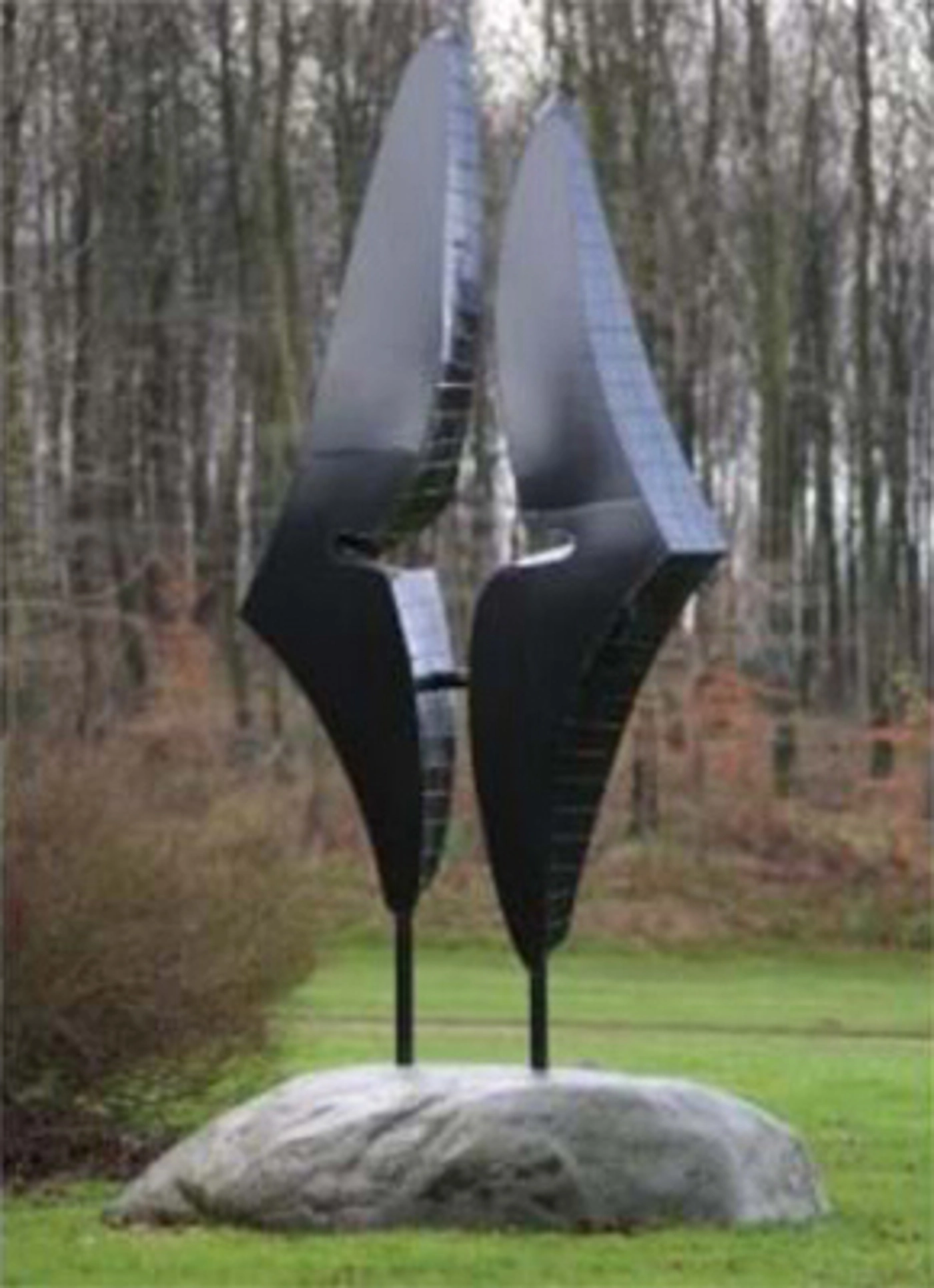 Couple is one early example of the local sculptor Hans Lembrecht Madsen’s works for the public space. Two long, black, organic shapes sway elegantly on steel pipes fastened into a large boulder. One shape is slightly taller than the other, yet the openings in them are precisely juxtaposed, as it sometimes happens for couples.