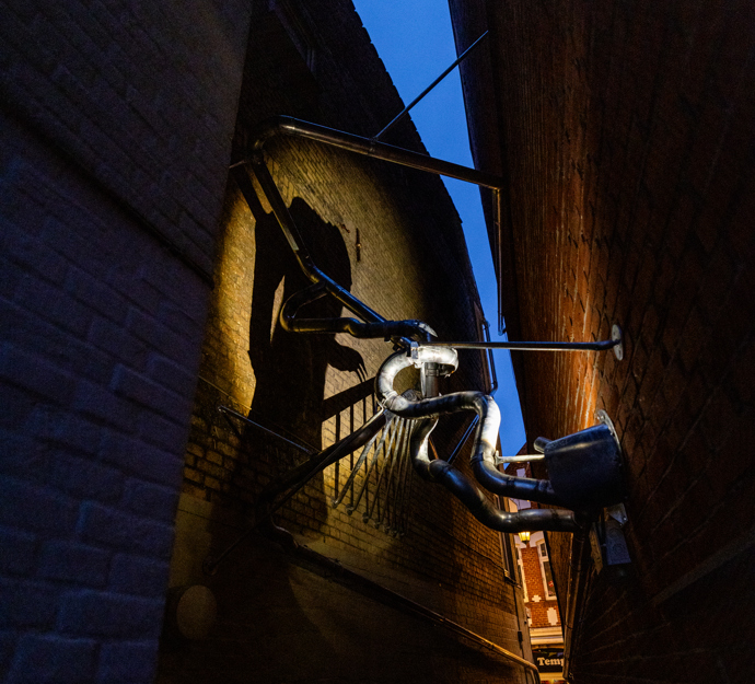 With Gargoyle, Vinyl -terror & -horror has modified and extended the existing drainpipes in the passage. By working sculpturally with the two pipes – while at the same time retaining their function – they become an installation with several different visual expressions. In the daytime, the work will appear as a three-dimensional composition and modification of materials which are familiar in townscapes. When darkness descends and the work is illuminated, the absurd and illogical piping casts a precise two-dimensional shadow that some will recognise from the silent film classic Nosferatu.