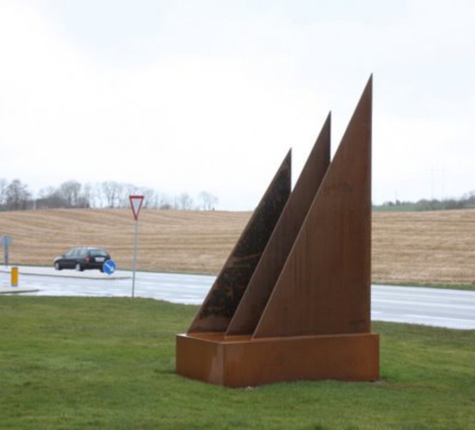 The composition, consisting of three triangular sheets of iron placed on a base, soon took on the desired rust-red colour. The vertical sheets are parallel and set in a slightly staggered pattern, giving the viewer an impression of three sails racing forward together, heading for new horizons and new adventures.