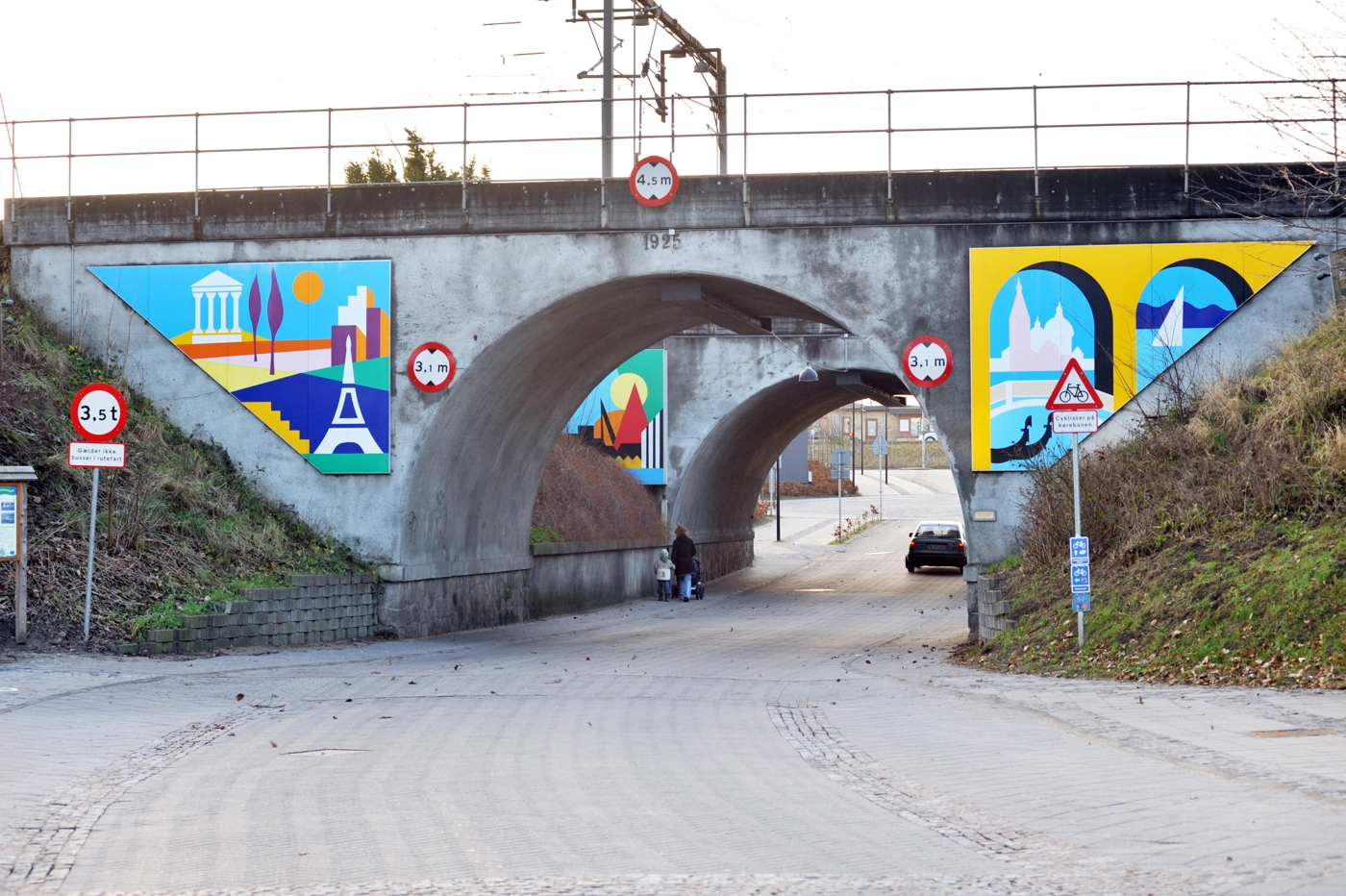 Pattburg ist ein Grenz- und Transitort. Von hier aus führt der Weg hinaus in die Welt, es ist der Ort, an dem Reisen beginnen können. Ulla Alberg hat den Blick hinaus in die Welt in den vier dekorativen Tafeln interpretiert, denen man auf dem Weg aus der Stadt heraus auf den Eisenbahnviadukten in Pattburg begegnet: Unter dem Titel Handel und Verkehr thematisiert sie Weite und Ferne mit Ikonen wie dem Eiffelturm und der Akropolis, Gondeln, Zwiebeltürmen und Brücken über mächtige Schluchten.