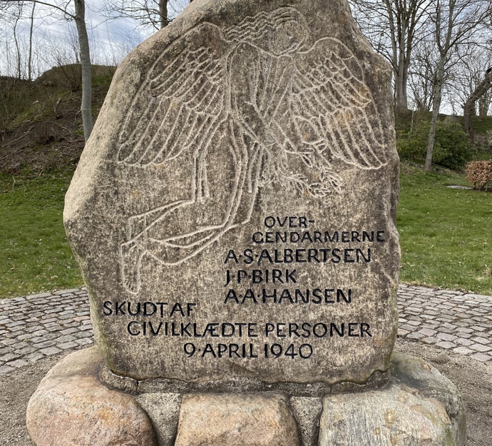 Das Spielfreudige und Lebensbejahende kontrastiert mit der Ernsthaftigkeit, die ebenfalls über dem Ort liegt. Denn dies ist auch ein Ort des Gedenkens. Hier wurden am 9. April 1940 im Vorfeld des Einmarsches der deutschen Besatzer drei dänische Gendarmen von deutschen Infanteristen in Zivil getötet, woran das steinerne Ehrenmal hier im Gendarmengarten erinnert.