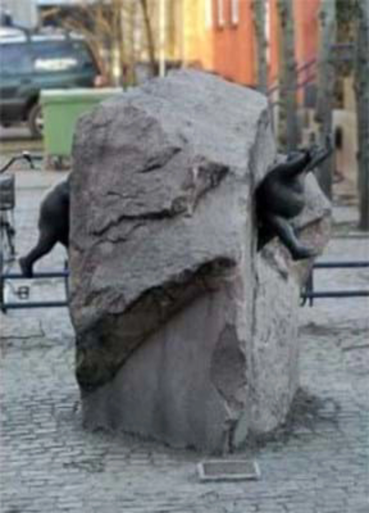 Der eine Pummelige ist von hinten in gebückter Haltung zu sehen, wie er auf dem Weg in den Stein hinein ist, während der andere aufrecht und mit zum Jubel hochgerissenen Armen auf der anderen Seite herausläuft. Die moseholmschen Protagonisten sind keine durchtrainierten Athleten, die den heutigen körperlichen Idealen entsprechen. Vielmehr treten diese kleinen wohlgenährten 'Dickerchen' seit den 1980er-Jahren in Moseholms Werken auf und sind immer eifrig bemüht, Gesteinsbrocken über Kanten zu schieben, sich gegenseitig an senkrechten Flächen hochzuziehen oder, wie hier, allen Naturgesetzen zum Trotz durch Mauern zu laufen.