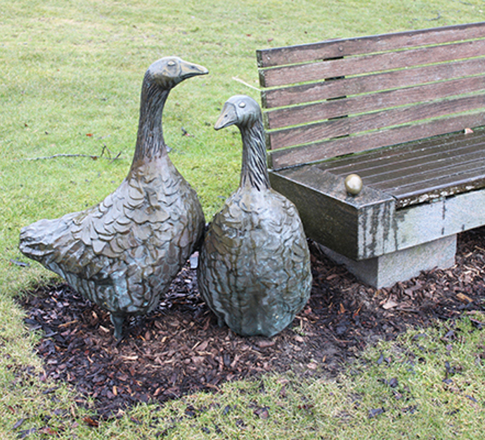 Auf der von Bildhauer Thorkild Junggren Have entworfenen stabilen Bank sitzen Einheimische und Besucher gleichermaßen bequem. Gänse und Eier wurden von seinem Vater, dem legendären Gartenarchitekten, Künstler und Professor J. P. Junggren Have entworfen, jedoch von seinem Sohn in Bronze gegossen und angefertigt.
