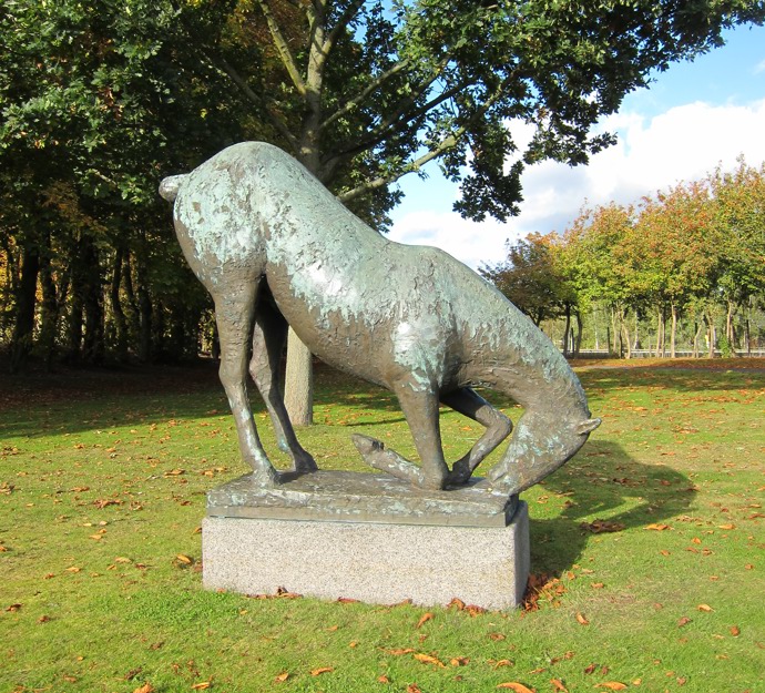Sich hinlegendes Pferd ist eine detaillierte Darstellung eines ausgewachsenen Pferdes, das im Begriff ist, sich hinzulegen. Das Tier knickt in der Vorderhand ein, neigt das Gewicht seines Körpers nach rechts und stützt sein Maul auf den Boden. Das Hinterteil ragt noch voll in die Höhe. Die Pose bildet einen Linienverlauf von oben nach unten, den Wehding noch verstärkt, indem er die Skulptur so positioniert, dass das Hinterteil des Pferdes quasi bündig in Richtung der hohen Bäume im Hintergrund, der Kopf dagegen nach unten auf den Platz davor zeigt.