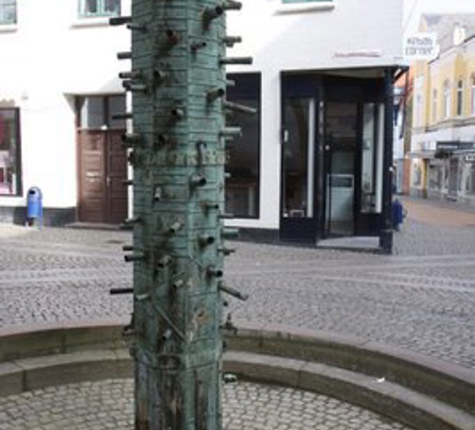 Diese Wasserkunst gehört zu den beliebtesten Skulpturen in Apenrade. Das gemütliche Plätschern der vielen skurrilen Wasserhähne verleiht dem Mutter Stahlboms Platz Charme und Charakter. Die Wasserkunst besteht aus einem hohen Kupferrohr mit einer Vielzahl von Hähnen und Rohren, aus denen das Wasser rinnt. Das Werk kann als Verweis auf den alten Stadtbrunnen und seine vier Gatt-Öffnungen sowie auf die maritime Geschichte Apenrades interpretiert werden, da es die Wasserabflussöffnungen einer Schiffswand nachempfindet.