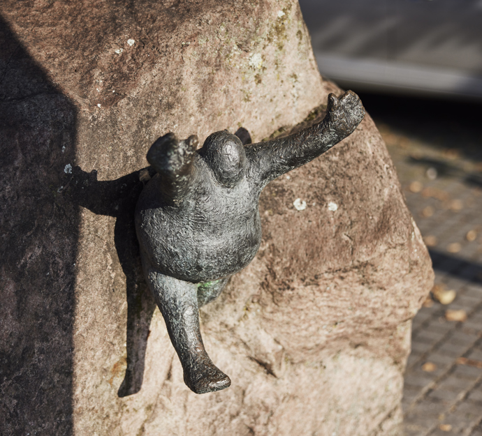 De små velnærede mandstumlinger har optrådt i Moseholms værker siden 1980’erne og er altid i færd med at knokle med at skubbe sten ud over kanter, hive hinanden op ad lodrette flader eller som her trodse alle naturlove og løbe igennem muren.