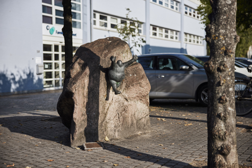 To af Keld Moseholms karakteristiske små tyksak-mænd i bronze kæmper med at bryde igennem en fem tons tung granitsten. Den ene lille mand ses bagfra i nedbøjet positur, hvor han er på vej ind i stenen, og den anden løber oprejst ud på forsiden med armene i en jublende gestus. Hos Moseholm er der ikke tale om veltrænede kroppe, der lever op til tidens sportsmandsidealer.
